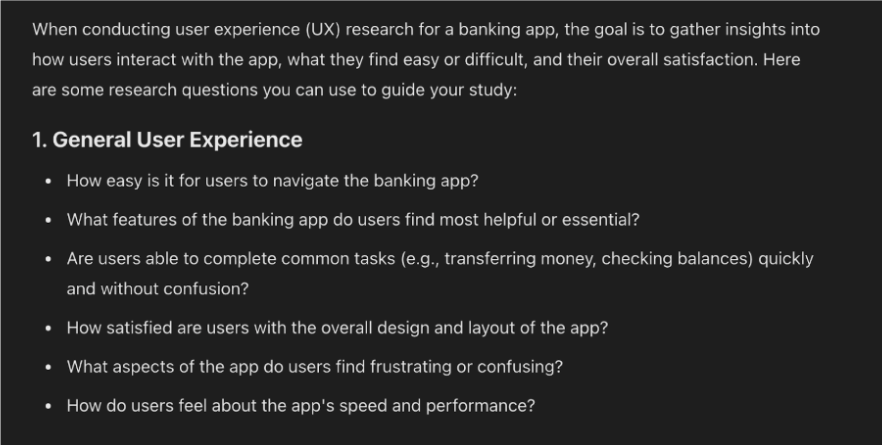 For example, when asked to “write me research questions for finding out the user experience of a banking app”, this tool gave solid recommendations.